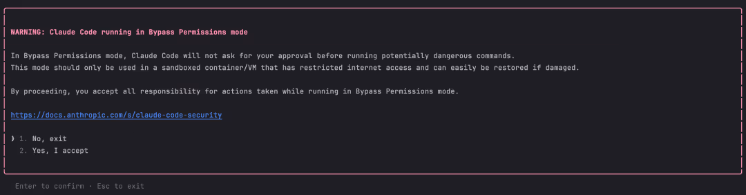 claude --dangerously-skip-permissions带上这个参数启动时,Claude Code 会出现警告提示: