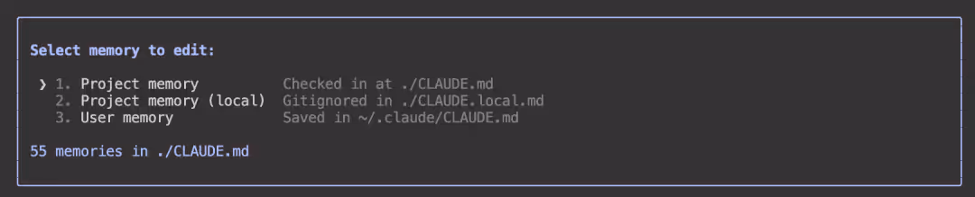 选择一个记忆文件回车进行编辑,其中第一个就是使用 /init 初始化命令生成的,第二个已废弃,第三个是用户级记忆文件。