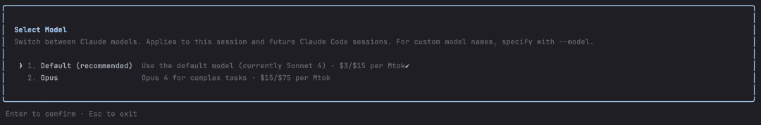 Claude Code 目前支持 Claude Opus 与 Claude Sonnet 4 两个模型的灵活切换,使用 /model 命令进行切换: