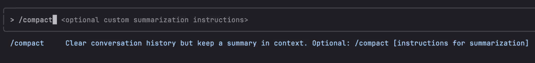 - 减少对话上下文大小 :当对话历史变得很长时,使用 /compact 可以压缩对话内容,减少令牌使用量。
