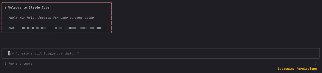 你需要点确认(Yes)才能开启 Bypassing Permissions 模式,开启此模式后,终端下面会出现黄色的 Bypassing Permissions 模式提示:
